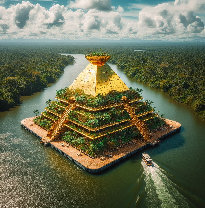 Cinco torres de vidro, com jardins suspensos, elevadores de vidro externos (ou bloco transparente contendo o elevador) e um shopping center na base: torre norte (azul/água-marinha), torre sul (verde/esmeralda), torre oeste (roxa/ametista), torre leste (amarela/topázio) e torre central mais alta (branca/diamante) conectadas no topo por um feixe de luz/laser, formando uma pirâmide sobre a cidade. Macro torres de Campus Verde das Universidades Incubadoras Globais (www.unig.org).